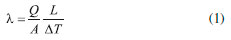 Todos os constituintes foram previamente secos em estufa na temperatura de 110 ± 10 °C por 24 h e, após, foram realizadas as misturas pré-determinadas para cada uma das massas cerâmicas. As mesmas foram homogeneizadas por um período de 10 min com auxílio de um misturador mecânico tipo planetário, ocorrendo a adiçao de 12% de água em relaçao ao valor total de massa. Posteriormente, o material foi acondicionado em recipientes plásticos vedados por um período de 24 h para assegurar uma hidrataçao homogênea. As placas cerâmicas foram prensadas no formato quadrado por uma matriz macho-fêmea com dimensoes de 135 mm x 135 mm através da aplicaçao de uma pressao de compactaçao de 300 kg cm-2. A quantidade de massa requerida para cada molde foi determinada para que as placas tivessem espessura aproximada de 15 mm. Para o ensaio de resistência à compressao foi moldado bloco cúbico com dimensoes aproximadas de 25 mm. Após conformaçao, os corpos-de-prova foram lavados e secos em estufa na temperatura de 110 ± 10 °C por 24 h. Após a secagem, os corpos de prova foram sinterizados à temperatura de 1300 °C. Definiu-se o ciclo de queima com três patamares: no primeiro patamar foi utilizada uma taxa de aquecimento de 5 °C min-1 até a temperatura de 150 °C, onde permaneceu por 10 minutos para eliminaçao da umidade superficial. No patamar seguinte a taxa de aquecimento foi de 3 °C min-1 até a temperatura de 500 °C, onde permaneceu por mais 10 minutos para eliminaçao dos gases originados da combustao e reaçoes do material. No terceiro patamar a taxa de aquecimento foi de 5 °C min-1 até a temperatura de 1300 °C, permanecendo neste patamar por 30 minutos. O resfriamento foi feito de forma natural dentro do forno após o seu desligamento.33 Os ensaios para caracterizaçao física do material foram realizados por procedimentos laboratoriais de acordo com a normativa NBR 6220/11,34 densidade de massa aparente, porosidade aparente e absorçao de água. O ensaio de resistência à compressao foi realizado seguindo as orientaçoes da NBR 6224/01.35 A investigaçao da microestrutura das placas cerâmicas obtidas foi realizada através da microscopia eletrônica de varredura (MEV). O método de difraçao de raios X foi utilizado para identificar as fases existentes e as transformaçoes ocorridas após os materiais serem submetidos ao processo de sinterizaçao. Para determinaçao da condutividade térmica das placas cerâmicas foi utilizado o método de fluxo de calor em regime estacionário, norma DIN EN12667,36 usando-se equipamento da LaserComp modelo 304. A média do fluxo de calor é usada para calcular a condutividade térmica (λ) e resistência térmica (R), de acordo com a Lei de Fourier conforme a Equaçao 1. ![]() λ = condutividade térmica [W m-1 K-1]; Q = quantidade de calor transmitida [J]; A = área [m2]; L = espessura [m]; ΔT = diferença na transferência de temperatura entre as placas [K].