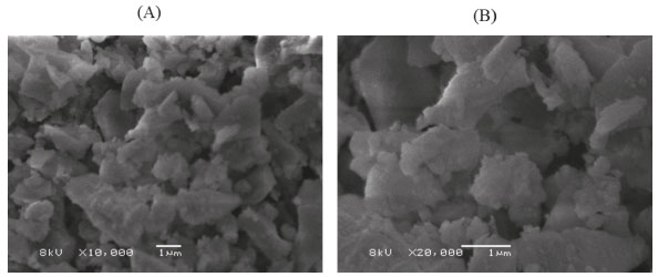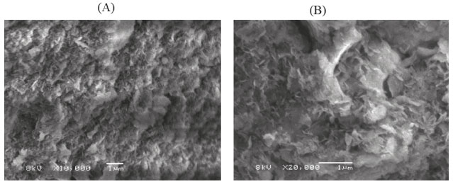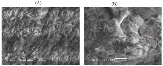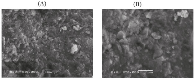 Conforme do diagrama de Winkler31 podemos observar que o lodo de ETA utilizado pode ser classificado como um lodo arenoso. A morfologia de granulaçao bastante refinada comparada a outros lodos de estaçao de tratamento32 é perceptível também pela imagem de microscopia eletrônica de varredura mostrada na Figura 10 com 10000 (A) e 20000 (B) vezes de aumento.