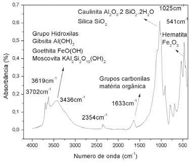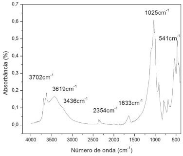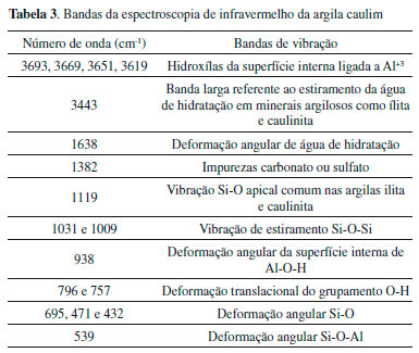 A análise de infravermelho da argila caulim mostrada na Figura 4 confirma a composiçao com bandas referentes à presença de sílica, alumina, caulinita e ilita, conforme as vibraçoes especificadas na Tabela 3.