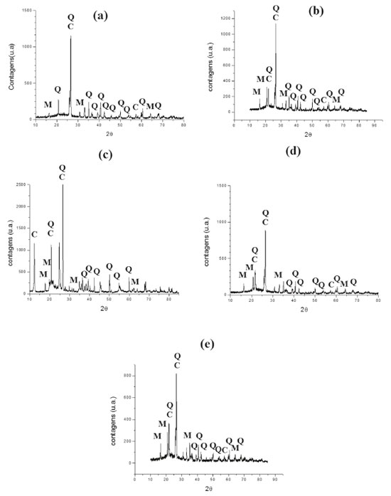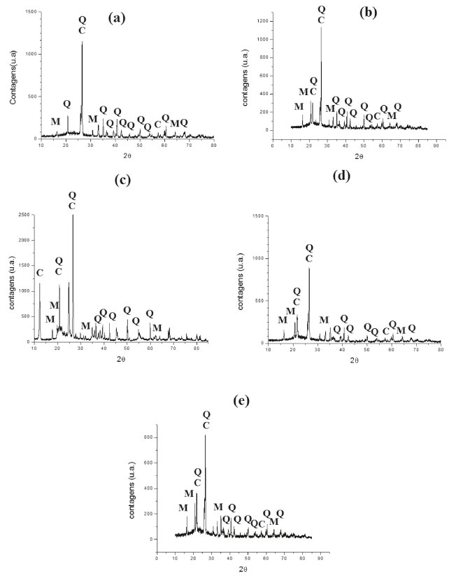 Figura 11. Difratograma das placas cerâmicas (a) AC, (b) AC20, (c) AC20/10, (d) AC20/20 e (e) AC20/30