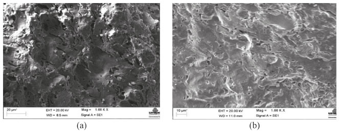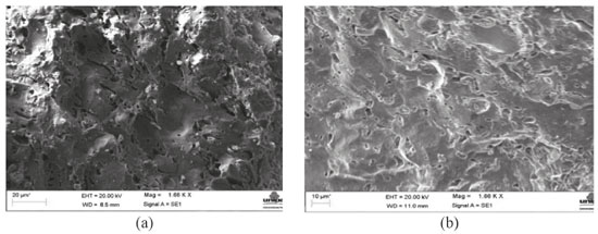 Figura 14. Fotomicrográficas em MEV da superfície de ruptura: (a) AC 20/10 (10% LETA); (b) AC 20/30 (30% LETA)