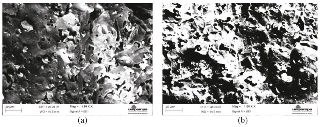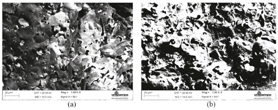 Figura 13. Microscopia eletrônica de varredura da superfície de ruptura: (a) AC (100% argila caulim); (b) AC 20 (80% argila caulim e 20% sílica da casca de arroz)