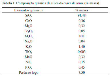 MATERIAIS E MÉTODOS Como matérias-primas, foram utilizadas a argila caulim, adquirida da empresa Helager Indústria e Comércio Ltda, a sílica da casca de arroz, fornecida pela empresa Sílica Verde do Arroz LTDA, e o lodo de ETA, coletado na estaçao de tratamento de águas da cidade de Alegrete/RS. Caracterizaçao das Matérias-primas Sílica da casca de arroz A sílica utilizada no desenvolvimento deste trabalho foi produzida pelo processo de geraçao de energia através da queima casca de arroz com temperatura controlada. Essa sílica é obtida através da combustao da casca de arroz em leito fluidizado e seu processo de obtençao conta com um sistema de automaçao no intervalo de temperatura entre 600 °C e 700 °C, que permite a extraçao da sílica da casca de arroz com estrutura predominantemente amorfa. Análises de fluorescência de raios X da sílica extraída da casca de arroz foram realizadas em um equipamento Philips, modelo PW 2400, com tubo de 3 kW e alvo de ródio. Foram usados os procedimentos de operaçao do equipamento e as normas NBR 964424 e NBR 128601.25 A Tabela 1 mostra que o principal constituinte da sílica da casca de arroz utilizada é o óxido de silício (91,48%) e óxidos fundentes, tais como os óxidos de cálcio (0,36%) e potássio (1,40%), os quais ocorrem em quantidades extremamente baixas, mas que possibilitam durante a sinterizaçao a formaçao de fase vítrea. O valor de perda ao fogo de 3,50% se deve ao elevado carbono residual presente. Tal situaçao indica a necessidade de observaçao da temperatura de obtençao das cinzas tendo em vista que estas definem a quantidade de carbono residual, além de estudos prévios indicarem uma reduçao considerável deste a 1100 °C.26