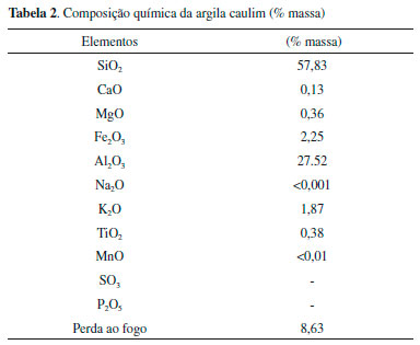 Argila caulim A argila caulim utilizada foi analisada por fluorescência de raios X e a análise mostrada na Tabela 2, segundo a classificaçao da NBR 10237,30 a classifica como silicoaluminosa. A argila caulim utilizada é constituída basicamente por óxido de silício (57.83%), alumina (27.52%), por óxidos fundentes, como óxido de ferro (2.25%) e óxido de potássio (1.87%), o qual é um bom formador de fase vítrea. Apresenta perda ao fogo de 8.63%, provavelmente pela presença de compostos orgânicos. Análises de CHN da argila caulim utilizada apresentaram quantidades mássicas médias de 0,24% de carbono, 0,49% de hidrogênio e 0,12% de nitrogênio.