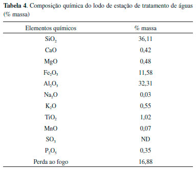 Lodo de estaçao de tratamento de água A análise de fluorescência de raios X mostrada na Tabela 4 confirma que o lodo de ETA é um composto sílicoaluminoso constituído basicamente por de óxido de silício (36,11%), na forma de quartzo, alumina (32,31%), óxido de ferro (18,58%), óxido de magnésio (0,48%), óxido de cálcio (0,42%), formadores de fase vítrea além de constituintes residuais que despertam interesse da indústria cerâmica. Apresenta perda ao fogo de aproximadamente 16,88% pela presença da caulinita e matéria orgânica. As análises de CHN do lodo utilizado apresentaram 6,77% de carbono, 2,21% de hidrogênio e 0,58% de nitrogênio.