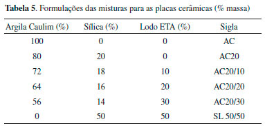 A perda ao fogo do lodo de ETA é de 16,88% (Tabela 4) e, portanto, o somatório de perda ao fogo dos constituintes é bastante elevado, chegando a 29,01%, uma vez que a sílica da casca de arroz e a argila caulim apresentam perda ao fogo de 3,5% (Tabela 1) e 8,63% (Tabela 2), respectivamente. Este dado é compatível com as prováveis baixas temperaturas na obtençao e beneficiamento destas matérias primas. Nesse sentido, quando adicionados e/ou substituídos na massa cerâmica e submetidos a tratamento térmico, proporcionam a formaçao de poros, provavelmente, pela presença de argilominerais, hidróxidos e matéria orgânica. Procedimento experimental As placas cerâmicas foram obtidas por prensagem uniaxial, a partir de diferentes percentuais de mistura da sílica obtida a partir da queima com temperatura controlada da casca de arroz, lodo de ETA e argila caulim. Os critérios básicos determinantes para a escolha do desenvolvimento das placas cerâmicas com o objetivo de avaliar o desempenho térmico foram investigados. Os melhores resultados no desempenho de propriedades mecânicas e térmicas foram obtidos quando utilizados diversos traços de substituiçao desses resíduos em uma massa cerâmica. As seis formulaçoes testadas para as massas cerâmicas (Tabela 5) foram: 100% argila caulim (AC) e 80% de argila caulim e 20% de sílica (AC20), sendo esta ultima considerada como uma mistura de referência. As demais formulaçoes testadas foram realizadas através de substituiçoes parciais na mistura de referência por lodo de ETA em teores de 10% (AC20/10), 20% (AR20/20) e 30% (AR20/30), sendo essas quantidades determinadas em massa. Uma mistura na ausência da argila caulim contendo 50% de sílica e 50% de lodo de ETA foi testada para fim de ensaios comparativos, sendo denominada como SL 50/50.