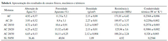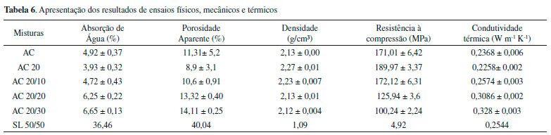 RESULTADOS E DISCUSSAO Propriedades físicas e mecânicas A Tabela 6 apresenta os resultados dos ensaios de absorçao de água, porosidade aparente, densidade de massa aparente, resistência à compressao e condutividade térmica das placas cerâmicas estudadas. A adiçao de sílica da casca de arroz proporciona uma diminuiçao na absorçao de água (de 4,92% ± 0,37 para 3,93% ± 0,32%), na porosidade aparente (de 11,31% ± 5,2 para 8,9% ± 3,1%) e na condutividade térmica (de 0,2368 ± 0,006 W m -1 K-1 para 0,2258 ± 0,002 W m -1 K-1).
