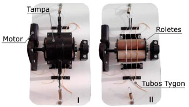 ![]() Figura 1. Bomba peristáltica; (I) com a tampa superior; (II) sem a tampa superior