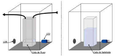![]() Figura 2. Ilustraçao do fotômetro desenvolvido; Modo de análise em fluxo (esquerda) e modo de análise em batelada (direita)