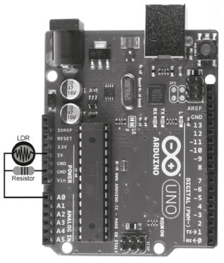 ![]() Figura 3. Circuito eletrônico - LDR e Arduino. LDR - 3 mm e resistor de 10 kΩ