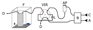 ![]() Figura 4. VIR - Válvula de injeçao rotacional; L: alça de amostragem (780 µL); C: fluido transportador