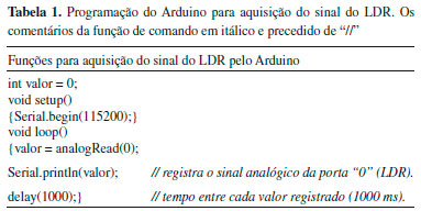 Para a obtençao do sinal analítico foi utilizado um micro controlador Arduino, responsável por captar o sinal analógico do LDR e enviá-lo para o microcomputador na forma de sinal digital. O circuito eletrônico que conecta o LDR ao micro controlador Arduino encontra-se exemplificado na Figura 3. Para que o Arduino execute a funçao de obter o sinal do LDR e exportá-lo para o microcomputador foi utilizado o programa apresentado na Tabela 1.