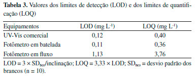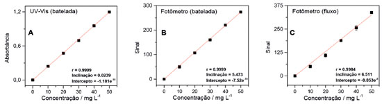 Pela análise da Figura 5 nota-se que os três modos de análise forneceram calibraçoes com coeficientes de correlaçao próximos de 1, demonstrando forte correlaçao entre os eixos. O desvio padrao relativo na curva obtida pelo espectrofotômetro de UV-Vis, fotômetro em batelada e em fluxo foram de 1%, 3% e 6%, respectivamente. Como pode ser observado na Tabela 3, os limites de detecçao (LOD) e quantificaçao (LOQ) do espectrômetro UV-Vis e do fotômetro em batelada foram da mesma ordem de magnitude, no entanto, para o fotômetro em fluxo, o limite de detecçao e quantificaçao foram da ordem de dez vezes superiores devido aos diferentes arranjos experimentais, à maior diluiçao das amostras e reagentes e se tratar de medida cinética, diferente das condiçoes em estado estacionário. Vale ressaltar que as medidas empregando dispositivo "Arduino" foram registradas como sinal analítico, compreendido entre 0 (forte incidência de luz sobre o LDR) e 1024 (ausência de luz sobre o LDR).