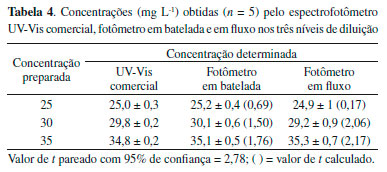 Para avaliar a exatidao e precisao das determinaçoes, três amostras do azo corante acid-red-283 (25, 30 e 35 mg L-1) foram preparadas pela diluiçao da soluçao estoque. Na Tabela 4 sao apresentados os valores obtidos quando analisadas as diferentes concentraçoes preparadas do azo corante (25, 30 e 35 mg L-1). Os resultados foram comparados e nao se mostraram estatisticamente diferentes ao nível de 95% de confiança (teste t Pareado). Os desvios padrao relativos obtidos pelo fotômetro em batelada e em fluxo foram respectivamente da ordem de 1,7 e 3%. No que se refere às análises empregando o espectrômetro de UV-Vis comercial, o desvio padrao relativo foi da ordem de 0,8%. O fotômetro, tanto operado em modo batelada quanto em fluxo apresentou desempenho satisfatório, proporcionando boa exatidao e precisao quando comparado com o espectrômetro UV-Vis comercial e os valores de desvio padrao relativo foram baixos e estao concordantes com os valores aceitáveis na literatura.12,13