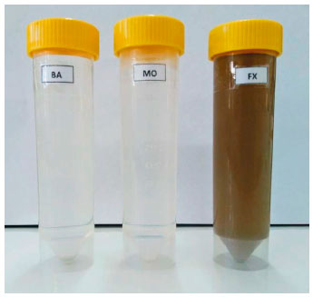 ![]() Figura 1. Amostras de basalto (BA), monzogranito (MO) e finos de xisto (FX) após dissoluçao por ultrassom