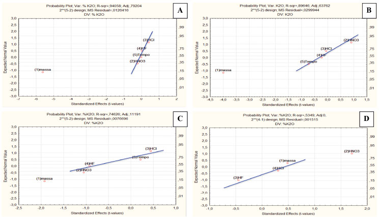 RESULTADOS E DISCUSSAO Otimizaçao do método de preparo de amostra Utilizando o planejamento fatorial fracionário 25-2 foram obtidos os gráficos normais dos efeitos para a determinaçao de K nas amostras de rochas. O gráfico normal de efeito padronizado é uma alternativa para avaliar os resultados de um planejamento fatorial, completo ou fracionário, a fim de avaliar os efeitos dos fatores experimentais investigados.20 A Figura 2A apresenta o gráfico normal de efeitos para o planejamento fatorial fracionário 25-2 para a amostra de basalto.
