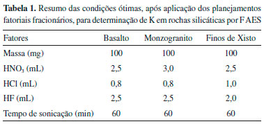 PARTE EXPERIMENTAL Instrumentaçao As determinaçoes de K foram realizadas em modo emissao, utilizando um espectrômetro de absorçao/emissao atômica modelo AAnalyst 200 (Perkin Elmer, Connecticut, EUA), com chama de ar/acetileno, nas vazoes de 10,0 L min-1 e 2,5 L min-1, respectivamente; comprimento de onda de 766,49 nm e fenda espectral de 2,7 mm, conforme as recomendaçoes do fabricante. Para o preparo das amostras foi utilizado um banho ultrassônico, modelo Elmasonic S 40 (H), com potência nominal de 140 W e frequência ultrassônica de 37 kHz (Elma, Singen, Alemanha). As amostras foram pesadas utilizando uma balança analítica Ohaus Adventurer, modelo AR 2140 (Pine Brook, NJ, EUA), com uma resoluçao de 0,1 mg e tara máxima de 210 g. Reagentes e amostras Todos os reagentes utilizados neste estudo foram de grau analítico. Para o preparo das soluçoes foi utilizada água deionizada, obtida a partir de um sistema de destilaçao em vidro, modelo MA078/5 (Marconi, Brasil) e, posteriormente, eluída em um desionizador modelo CS1800 Evolution (Permution, Brasil). Uma soluçao estoque contendo 10000 mg L-1 de K (Fluka, Buchs, Alemanha) foi utilizada. Para a dissoluçao das amostras de rochas foi utilizado HNO3 65% (m/m) (Vetec, Brasil), bidestilado abaixo do seu ponto de ebuliçao no destilador de quartzo MA 075 (Marconi, Brasil). Nessa etapa também foi utilizado ácido HF 40% (m/m) (Vetec, Brasil), HCl 38% (m/m) (Sigma-Aldrich, Brasil) e H3BO3 99,5 % (m/m) (Sigma-Aldrich, EUA). Para avaliar a exatidao, os seguintes materiais de referência certificados foram utilizados: CRM MBL-1 (Basalto) e CRM MGL-1 OShBO (Granito), provenientes do Central Geological Laboratory (CGL, Mongólia). As amostras de rochas como fonte de K investigadas foram o basalto, o monzogranito e finos de xisto, todas cedidas pela Embrapa Clima Temperado (Pelotas/RS), as quais fazem parte de um banco de amostras constituído por diversas rochas coletadas em diferentes locais da Regiao Sul do Brasil. A amostra de basalto é proveniente da Pedreira Carolo, em Montenegro (RS); a de monzogranito da Pedreira Silveira, em Pelotas (RS) e a amostra de finos de xisto é proveniente da Petrobras/SIX, em Sao Mateus do Sul (PR). Todas as amostras foram adequadas quanto às suas granulometrias de modo que 100% de cada material apresentou partículas menores que 0,3 mm. Otimizaçao do método de preparo de amostra Os parâmetros experimentais investigados para o desenvolvimento do método tiveram como base o descrito pela US EPA 3052A12 que orienta que a decomposiçao total de matrizes complexas contendo silicatos deve ser feita a partir de um tratamento ácido e abertura em forno de micro-ondas. Um planejamento fatorial fracionário 25-2 foi utilizado para a otimizaçao do método de preparo das amostras das diferentes rochas silicáticas investigadas, usando o programa STATISTICA (STATSOFT STATISTICA 7.0). Para tal, foram utilizadas as seguintes variáveis experimentais e respectivos níveis: massa da amostra (100 e 200 mg), volumes de HNO3(2,5 e 3,0 mL), HCl (0,8 e 1,0 mL) e HF (2,5 e 3,0 mL) e tempo de sonicaçao (60 e 120 minutos). Os ensaios foram realizados de forma aleatória, de acordo com a ordem dos experimentos que foi gerada pelo software. A Tabela 1S (MS) apresenta o planejamento fatorial aplicado. Este primeiro planejamento resultou em condiçoes ótimas para as amostras basalto e monzogranito, conforme discussao posterior. Para a amostra de finos de xisto foi necessário aplicar um novo planejamento fatorial fracionário do tipo 24-1, objetivando uma combinaçao mais adequada das condiçoes experimentais (Tabela 2S). Neste, os seguintes fatores foram avaliados, também em dois níveis: massa da amostra, e volumes de HNO3, HCl e HF. De acordo com as condiçoes ótimas para cada amostra, estas foram pesadas em triplicata, diretamente em frascos volumétricos de polipropileno (PP). Após, fez-se a adiçao dos ácidos HNO3, HCl e HF, e os frascos foram transferidos para o banho ultrassônico. As amostras foram sonificadas à temperatura ambiente, com os frascos semiabertos, para possível alívio da pressao. Após 1 hora de ultrassom, as mesmas foram aferidas a 50 mL com água desionizada. O aspecto final das soluçoes é apresentado na Figura 1. Além dessa diluiçao inicial das amostras para 50 mL, foi necessária uma segunda diluiçao para adequaçao à faixa linear da curva de calibraçao. Para basalto uma alíquota de 0,2 mL foi diluída para um volume final de 10 mL; monzogranito: 0,1 mL para 20 mL; e finos de xisto: 0,1 mL para 10 mL.
