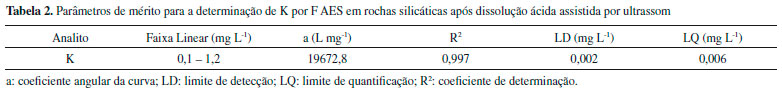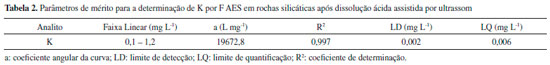 Parâmetros de mérito Os parâmetros de mérito para a determinaçao de K nas amostras foram obtidos a partir dos dados da curva de calibraçao. Na Tabela 2 pode-se observar que a faixa linear de trabalho utilizada é adequada para o método proposto. A curva de calibraçao foi construída em meio aquoso e apresentou adequada linearidade com ajuste satisfatório, observado através do coeficiente de determinaçao, bem como sensibilidade adequada para a quantificaçao. Os limites de detecçao e quantificaçao alcançados se apresentaram satisfatórios para a determinaçao de K nas amostras de rochas silicáticas investigadas.