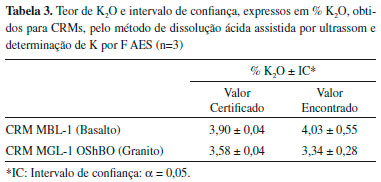 Avaliaçao da exatidao Com o intuito de avaliar a exatidao do método para a determinaçao de K em rochas silicáticas pela técnica de F AES, dois materiais de referência certificados de origem geológica foram utilizados. Os mesmos foram preparados de acordo com o método desenvolvido e os resultados obtidos sao apresentados na Tabela 3.