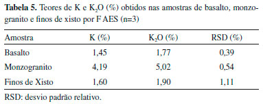 De acordo com os resultados apresentados na Tabela 4, pode-se verificar uma faixa de recuperaçao adequada para os níveis de adiçao avaliados de K, variando entre 83,3 a 110,6%. Constatou-se ainda que o método apresenta exatidao adequada para análise proposta. Além disso, foram encontrados baixos valores de desvio padrao, o que evidencia também uma alta precisao. Determinaçao de K nas amostras de rochas Os teores de K obtidas nas três amostras das rochas silicáticas investigadas, preparadas usando o método de dissoluçao assistida por ultrassom, sao apresentados na Tabela 5.