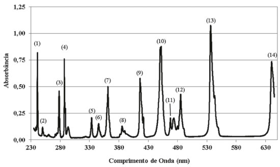 ![]() Figura 1. Espectro de absorbância da soluçao de Ho2O3 e os 14 picos de máxima absorbância usualmente certificados