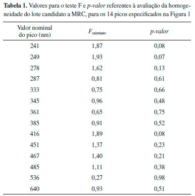 Homogeneidade do candidato a MRC Com as 10 ampolas selecionadas para a avaliaçao da homogeneidade, verificou-se que nao houve tendência na seleçao das unidades utilizando a regressao linear. A análise da homogeneidade dentro e entre as unidades se baseou na ANOVA, obtendo-se os valores de Fcalculado e p-valor. Para α = 0,05, glentre = 9 e gldentro = 50, o Fcrítico é de 2,12. Para que o lote seja considerado homogêneo, o Fcrítico deve ser maior que Fcalculado, e o p-valor deve ser maior que 0,05 (probabilidade de 95% de abrangência). Os dados de Fcalculado e p-valor para os 14 picos da soluçao de Ho2O3 produzida encontram-se na Tabela 1.
