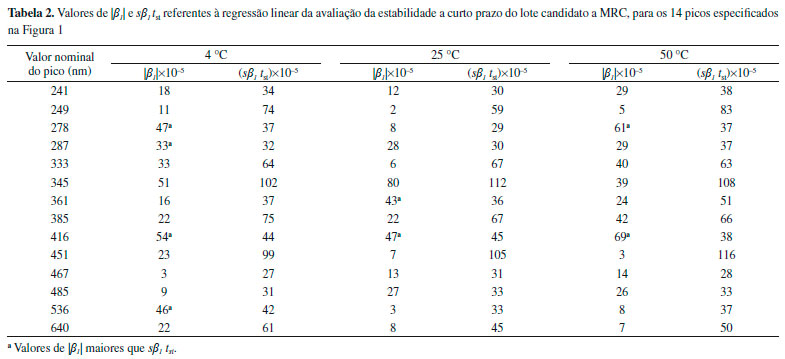 Como Fcrítico > Fcalculado e p-valor > 0,05 para os 14 picos analisados, o lote da soluçao de Ho2O3 foi considerado homogêneo. Estabilidade a curto prazo do candidato a MRC Para o estudo de estabilidade a curto prazo, inicialmente, os resultados foram analisados pela técnica estatística de regressao linear, na qual obteve-se o valor do coeficiente angular (β1) e do erro padrao (sβ1). Para indicar estabilidade, o valor de β1(em módulo) deve ser menor que o produto entre o sβ1 e o valor de tst(t-student, considerando aproximadamente 95% de confiança). Na Tabela 2, sao apresentados os valores de |β1| e sβ1 tst. Verifica-se que, para 8 picos de máxima absorbância da soluçao de Ho2O3(assinalados com a letra a na Tabela 2), a condiçao |β1| < sβ1 tst nao foi atendida.