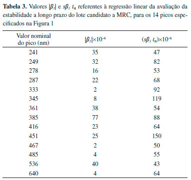 Com isso, foi necessário verificar se a tendência apresentada nesse estudo foi tecnicamente significativa, utilizando a Equaçao (2). Estipulou-se que a diferença entre Yestimado e Y0 deveria ficar menor que 30% da incerteza alvo de 0,15 nm para que a tendência encontrada no estudo nao fosse considerada significativa. ![]() em que Yestimado equivale ao comprimento de onda obtido pela regressao linear estimando um tempo de 5 semanas (duraçao do estudo) e Y0 é valor médio de comprimento de onda obtido nas leituras da primeira ampola. As diferenças relativas obtidas resultaram em valores menores que 30%, indicando que a inclinaçao da reta nao gerou instabilidade suficiente para que o valor de comprimento de onda saísse da faixa de incerteza da soluçao. Ou seja, para um prazo de 35 dias esses picos foram considerados estáveis. Por meio desse estudo, as temperaturas máxima e mínima de transporte do material puderam ser definidas como 50 °C e 4 °C, respectivamente, sendo que o material pode ficar exposto às temperaturas limites por até 5 semanas, o tempo total de estudo. Estabilidade a longo prazo do candidato a MRC A avaliaçao da estabilidade a longo prazo foi realizada durante 9 meses consecutivos. Os dados passaram por regressao linear, na qual obtiveram-se os valores de β1 e sβ1. Para indicar estabilidade, o β1(em módulo) deve ser menor que o produto sβ1 tst. Na Tabela 3, encontram-se os valores de |β1| e sβ1 tst.