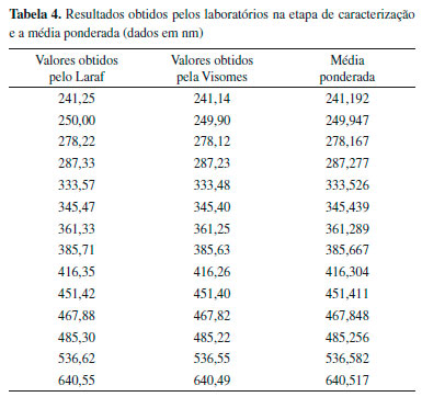 Para o estudo de estabilidade a longo prazo, verifica-se que, para todos os 14 picos de máxima absorbância do Ho2O3 analisados, |β1| ficou menor que sβ1 tst, indicando que nao houve tendência e demonstrando estabilidade por 9 meses, se mantido e armazenado à temperatura de 25 °C. Verificou-se que o estudo de estabilidade a curto prazo foi mais crítico que a estabilidade a longo prazo, apresentando uma tendência nos resultados devido às diferenças de temperatura extremas. Caracterizaçao do candidato a MRC Nesta etapa, foram distribuídas 3 ampolas do lote contendo a soluçao produzida para cada laboratório, portanto, 6 ampolas foram analisadas para obtençao do valor da caracterizaçao. Os resultados de caracterizaçao dos 2 laboratórios foram analisados quanto à compatibilidade através do índice zeta, no qual, para todos os picos, ficou confirmado que todos ficaram compatíveis. Dessa forma, os resultados dos laboratórios foram combinados por média ponderada,9 cujos valores constam na Tabela 4.