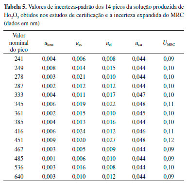 Estimativa da incerteza do MRC de Ho2O3 As incertezas padrao de cada estudo foram calculadas conforme ISO Guide 35.13 Para o estudo de estabilidade a longo prazo, a incerteza foi extrapolada em mais 3 meses, resultando num total de 12 meses. Dessa forma, o prazo de validade da soluçao de Ho2O3 foi estimado para 1 ano após a produçao. Os valores de cada incerteza padrao referentes aos estudos de certificaçao e a incerteza expandida do MRC estao apresentados na Tabela 5.