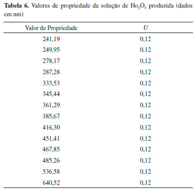 Atribuiçao do valor de propriedade O valor de propriedade da soluçao de Ho2O3 produzida foi apresentado para cada um dos 14 picos de máxima absorbância, nos comprimentos de onda certificados, sendo a média ponderada dos valores obtidos pelos 2 laboratórios. A incerteza da soluçao a ser considerada foi estabelecida como a maior incerteza encontrada dentre os 14 picos certificados: apenas um valor de incerteza expandida foi apresentado para os 14 picos. Os valores de propriedade dos 14 picos de máxima absorbância da soluçao de Ho2O3 produzida sao apresentados na Tabela 6.