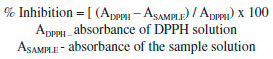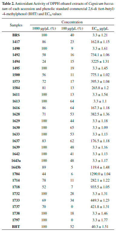 DISCUSSION The commercial standard phenolic structure, BHT (Butyl-hydroxy-toluene), was considered as one of the most widely used synthetic antioxidant in the food industry, therefore a comparison of its antioxidant potential with the accessions investigated in this study was carried out. It is observed that at the highest concentration tested (1000 µg mL‑1) all the accessions were active, and 14 out of the 29 access (Table 2), and the genotype BRS-Mari, showed EC50 (3.3 µg mL-1) less than BHT. At this same concentration, all these samples showed maximum antioxidant activity (100%), which can be compared to the potential of antioxidant BHT, since its antioxidant potential is in the 52% range, (EC50 40.0 µg mL-1). At a concentration of 100 µg µL-1, there was an intermediate percentage of free radical DPPH seized, between 0 and 65%. Accessions 1613, 1616, 1628, 1630, 1633 and 1637, are most significant in this concentration. All the others which had less activity than 50% were not considered as good scavengers of free radicals. Accessions extracts were also tested against DPPH at the concentration of 10 µg µL-1, however, none of the 29 samples, including the genotype (BRS-Mari), showed activity at this concentration level. Phenolic compounds are important components in various fruits and vegetables. It is important to quantify these compounds since they reveal information about the antioxidant activity, the quality of food and thus the potential benefits to human health.14 In recent years these compounds have been the target of numerous studies due to several reasons, but mainly to inhibit lipid peroxidation processes which increases shelf life of fatty foods. Analyzing random variable total phenols, through the use the Scott Knott test, because of the significance of accessions to the analysis of variance at the 5% level of probability, 21 (twenty-one) statistically equal groups were obtained. It seems that the group "A" consisted only of witness genotype BRS-Mari, which is the accession with the highest total phenolic content (985.33 mg GAE/g). The second group consisted only of accession 1643b, with 64.27% of the witness genotype phenols content. As can be observed, BRS accession showed 100% antioxidant activity at 1000 µg µL-1 and consequently, it was the accession that had the highest content of total phenols, suggesting that there is a strong evidence of the association between antioxidant activity and total phenol content, in this case. Since such a relationship for all accessesions cannot be claimed, through the observation of the accession 1494 (group E), for example, a considerable content of phenols (296.99 mg GAE/g) was shown, but its potential antioxidant in 1000 µg µL-1 was only 44%. The same occurred with accession in 1628 (U group), which had the lowest phenolic content of all accessions. However, it showed a significant value of antioxidant activity (71%) at 1000 µg µL-1. The accessions 1639 (group R) and 1797 (group S) showed a phenol content of 89.65 and 40.13 mg GAE/g, respectively, and EC50 3.30 µg µL-1. These results indicated that other compounds could collaborate to the antioxidant activity of these accessions. The failure to find a correlation between total phenolic content and scavenging capacity of free radicals can be explained by several factors. In fact, the contents of total phenols are not just responsible for all antioxidant potential of a test sample. Moreover, one should consider this synergism between the mixture of these antioxidant compounds, which makes the antioxidant activity not only dependent on the concentration of compounds that impart but also on the structure and interaction of these compounds.15 The high-performance liquid chromatography (HPLC) is among the most widely used techniques for identification and quantification of phenolic compounds, as a fast and high-resolution technique.16 In this study, the ethanol extracts were quantified on the content of phenolic acids and flavonoids in two different elution gradients (Table 1). The phenolic compounds quantified were chlorogenic acid, caffeic acid, rutin, quercetin, and apigenin. The selection of these compounds was based on a careful review of the literature. It was found that the presence of these phenolic compounds in peppers (Capsicum baccatum), which is the aim of our study, have been of great demand, in recent years, and consumer preference for peppers. It is also noted an increasing number of varieties available in supermarkets, consumed as vegetable cultivars as spices.15 In addition to considering the antioxidant potential and consequently the inhibitory power of lipid oxidation processes in food, these classes of phenolic compounds were the main objective of this study.