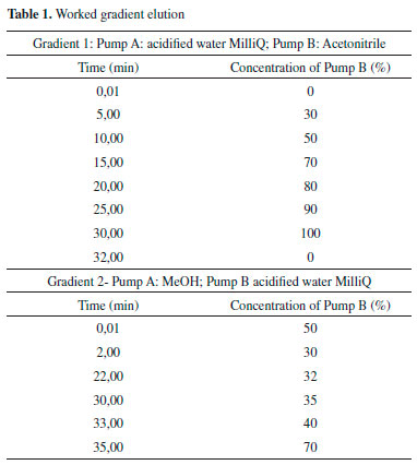 To identify and quantify the compounds in samples, comparisons were made of the retention times of the samples with retention times of pure commercial standards. After this preliminary analysis were made co-injections of pure standards and samples were made for further analysis of their retention times. Comparisons between the UV spectrum of the compounds and the commercial standards were also carried out.
