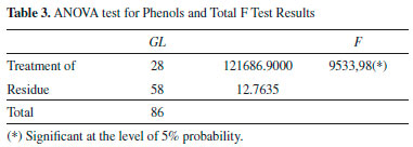 RESULTS Antioxidant activity The extracts were evaluated at concentrations of 1000, 100 and 10 µg/mL and expressed as the antioxidant activity (% Inhibition) and EC50 (extract concentration in µg/mL capable of reacting with 50% of the radical present in the DPPH solution). The results of the antioxidant activity of the DPPH and EC50 values are shown in Table 2, whereas the results of less concentration (10 µg mL-1) are not shown. Total phenols of the extracts analysis In this study, the quantification of total phenols content in different accessions of C. baccatum was performed using the Folin Ciocalteu, which is the most widely used techniques for this purpose. This reagent consists of a mixture of phosphomolybdic and phosphotungstic acids, wherein the molybdenum and tungsten are oxidized in the presence of certain reducing agents. In Table 3 the results of analysis of variance and the F test result can be observed. Table 4 contains the results of the concentration of total phenolics of each accession, expressed as gallic acid equivalents (GAE) per extract according to Scott Knott test. Quantification of phenolic compounds by HPLC Table 5 and Table 6 show a summary of the phenolic standards data obtained from the HPLC in the gradients 1 and 2. It also represents the retention times and the respective wavelengths of phenolic acids and flavonoids, as well as the respective area percentages showing the degree of purity of these standards. It was verified that in the gradient 1 it was possible to quantify levels of phenolic standards assessed in a larger number of accessions in relation to the gradient 2. Therefore, the Table 7 shows the quantification of phenolic acids and flavonoids in each accession analysed of gradient elution 1, obtained according to the Scott Knott test in order to determine the level as compared to higher limit of quantitation of these compounds.