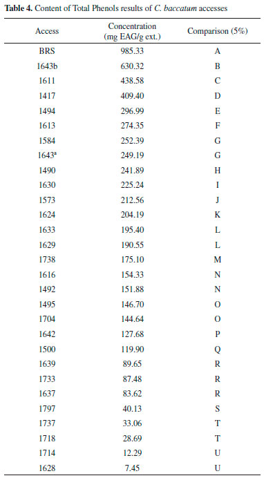 CONCLUSIONS Antioxidant activity was only observed at concentrations of 100 µg µL-1 and 1000 µg µL-1, considering the best accession of those that showed 100% activity, which were: BRS, 1490, 1495, 1611, 1613, 1629, 1630, 1633, 1639, 1642, 1643a, 1732, 1738, 1797. The Quantification of total phenols to 21 groups (Groups AU) statistically equal (985.33 mg) was obtained, with Group A consisting the best result, thus it appears that in group A the BRS accession was only observed, and this had the highest total phenolic content GAE/g). For the quantification of phenolic compounds by HPLC, in both gradients, it was observed that chlorogenic acid was measured in the standard phenolic greater number of accessions, compared to the others. The gradient 1, 1417 accession (1.54 mg/g) showed the highest content of chlorogenic acid, Access 1490 (0.74 mg/g), higher levels of caffeic acid, accession 1494 (0.34 mg/g) higher content of quercetin and accession 1714 (0.82 mg/g) higher concentration of rutin. In the gradient 2, accession 1613 showed a higher concentration of caffeic acid, chlorogenic acid, and 1633 BRS accession a higher content of rutin. The flavonoid apigenin has not been identified and quantified in any of the samples in those two gradients. It was observed that in the gradient 1 it was possible to quantify levels of phenolic patterns evaluated in a larger number of accessions. It is suggested that these differences are due to the difference of polarity between methanol and acetonitrile and other factors such as viscosity and the UV absorption band spectrum. The initial results showed in this work suggested that the BRS, 1643a, 1611 and 1613 accessions could be used as natural antioxidants for the food industry, and stand out from other accessions because they are considered good sources of antioxidants and phenolic compounds.