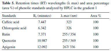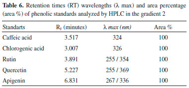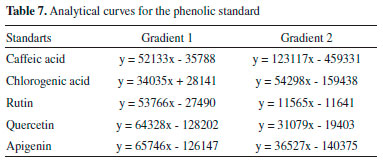 To prepare the samples to be injected, 10 mg of the extract was weighed and solubilized in 1 mL of mobile phase: 500 µL was pipetted of mobile phase contained in the pump A and 500 µL of mobile phase contained in the pump B, following this procedure for the two gradients. Twenty-nine extracts were filtered using of microfilters (Sartorius®) and syringes (BD Plastipak®) were then applied three times to each method, in the liquid chromatograph. Chlorogenic acid (Sigma-Aldrich), caffeic acid (Tedia Brazil), rutin (Merck), quercetin (Merck) and apigenin (Sigma-Aldrich) standards were used to measure the standard curves (Figures 2S to 11S in Supplementary material). For each phenolic standard were made curves (mass x peak area in µg) in varying concentrations (50 µg mL-1, 25 µg mL-1, 10 µg mL-1, 8 µg mL-1, 5 µg mL-1 and 2 µg mL-1), as can it is shown in the Table 7.