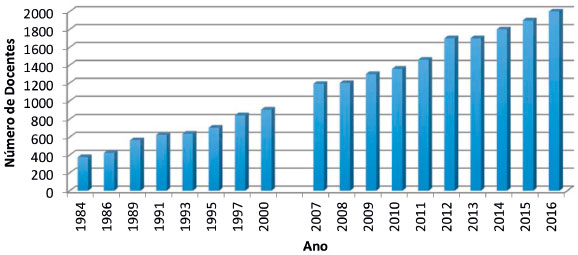 Quanto à evoluçao do corpo docente (Figura 4), no ano 2000 a pós-graduaçao em Química no Brasil contava com 906 docentes, enquanto que em 2016 o número de docentes era 2000. Ou seja, um número também maior do que o dobro (2,21). No caso da formaçao de mestres e doutores, no biênio 1998-2000, foram formados 1111 mestres e 642 doutores, revelando uma relaçao m/d = 1,73, enquanto que no biênio 2014 - 2016 esses números passam para 3266 mestres e 1878 doutores, mantendo a relaçao m/d praticamente igual, mas com crescimento observado entre os biênios de 2,94 vezes na formaçao de mestres e 2,93 vezes na de doutores.