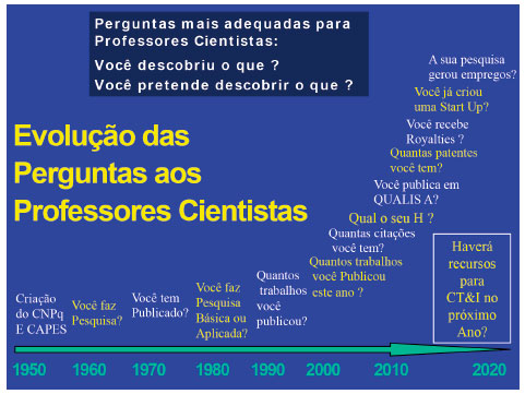 Ressalte-se que em 2018 constam na área de Química um total de 117 cursos, sendo 67 mestrados e 47 doutorados acadêmicos, dois mestrados profissionais e um mestrado em rede na área de educaçao/ensino de Química. Isto é adequado para a área?, isto é adequado para o país?? Certamente sim. Mas, ainda é muito pouco! Os ODS, por exemplo, apontam para um quadro abrangente de novos cenários de participaçao, sendo que a capacidade do profissional em atuar interdisciplinarmente é cada vez mais um atributo necessário. Precisamos criar novos programas e/ou reconfigurar os programas já existentes, com foco nos desafios atuais que compreendem a formaçao de conexoes entre o setor acadêmico, já muito bem consolidado, e o setor empresarial. Este tem demandas que incluem ampliar a sua taxa de inovaçao, promover a migraçao da produçao de insumos químicos de uso industrial para os de alto valor agregado, bem como juntar-se ao esforço nacional de implantaçao da manufatura avançada. Incluem-se ainda a organizaçao e a administraçao de toda a cadeia de valor e do ciclo de vida dos produtos, onde será necessária a integraçao de tecnologias e sistemas digitais, com geraçao de valores nas cadeias produtivas, na organizaçao de trabalho, nos modelos de negócios e na prestaçao de serviços inteligentes de internet a jusante, adequados às demandas dos consumidores. Neste século, a ciência brasileira está diante de uma mudança de paradigma1: se na década de 60 bastava ao professor universitário fazer pesquisa, na década de 80 a publicaçao de papers era condiçao obrigatória para ser considerado pesquisador. Várias vezes, nas últimas cinco décadas, o desafio (perguntas) apresentado aos professores pesquisadores mudou (Figura 5). Entretanto, as perguntas mais adequadas seriam: você descobriu o que? E você pretende descobrir o que?