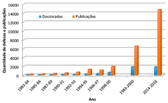 A POS-GRADUAÇAO EM QUIMICA: UM BREVE OVERVIEW Recentemente, em 2017, foi publicado o artigo "A IMPORTANCIA DA SOCIEDADE BRASILEIRA DE QUIMICA NA POS-GRADUAÇAO EM QUIMICA NO BRASIL",92 do Presidente da SBQ, Professor Aldo Zarbin, onde é destacado o papel da SBQ no fortalecimento da Pós-graduaçao em Química "Esse patamar de excelência foi alcançado pela força e comprometimento com que a SBQ atuou (e atua) nos diferentes segmentos em que interfere, como no sistema nacional de Pesquisa e Pós-Graduaçao, especificamente demonstrado nesse artigo." . "a grande comunidade da Química brasileira precisa entender definitivamente que nao há uma ciência forte sem uma Sociedade Científica forte por detrás. As centenárias Royal Society of Chemistry e American Chemical Society, com seus mais de 150.000 sócios, sao exemplos claros da inequívoca correlaçao entre a qualidade da Química que se faz em um país e a grandiosidade da sociedade que a representa. Nao seremos fortes, enquanto químicos, sem uma SBQ forte e representativa. Para isso é preciso que todos os atores estejam unidos. É preciso que a comunidade química brasileira, na sua totalidade, se veja na SBQ."92 As conclusoes desse artigo91, além de corretas, podem ser estendidas a todas as áreas em que a Química atua no Brasil. Um pequeno exemplo da abrangência e qualidade está registrada nas referências citadas neste artigo, e especialmente, as focadas na Formaçao do Químico, na Inovaçao e na necessidade de aproximaçao com o setor empresarial. O fato inegável é que, através da SBQ, a área de Química se capacitou para ordenar seu desenvolvimento e para localizá-la como instrumento de crescimento e competitividade econômica, bem-estar e fortalecimento científico do Brasil. Nesse sentido, vale retornar ao passado, em 2003, e ressaltar que o artigo "Eixos Mobilizadores em Química", fruto de uma grande articulaçao realizada no âmbito da SBQ fez uma análise da Pós-graduaçao em Química do Pais, com dados até o ano de 2000, até entao o ano da última avaliaçao da CAPES. A mais recente avaliaçao realizada pela CAPES utilizou dados até 2016. Sem qualquer pretensao de fazer uma analise exaustiva sobre os últimos 16 anos, apenas com o objetivo de deflagrar a discussao sobre o tema, faremos uma contextualizaçao das observaçoes extraídas do artigo de 2003 com a atualizaçao dos dados em 2016. No artigo de 20031 está registrado que: "Independentemente do parâmetro considerado, pode-se observar que as taxas de crescimento da área de Química mudam de linear para exponencial a partir dos anos 1990. Observando-se a Figura 3 com dados atualizados até 201693 a relaçao entre o número de publicaçoes e o número de doutores formados entre 1983 e 2000 foi, em média 3,49 enquanto que no biênio 2014 - 2016 foi 7,86. Um número maior do que o dobro (2,27x) do anterior.