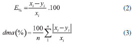 A Tabela 2 apresenta os parâmetros a, b e c das equaçoes (5) e (6) e os valores de desvio médio absoluto (dma), além da amplitude dos erros percentuais dos valores de viscosidade cinemática calculados com aquelas equaçoes. Pode-se observar que os coeficientes de correlaçao encontrados para a aplicaçao das equaçoes (5) e (6) evidenciam uma ótima concordância entre os valores calculados e os experimentais. Por outro lado, pode-se observar que no caso da aplicaçao da equaçao (7) nao há uma concordância satisfatória entre os valores de viscosidade calculados e os experimentais, relativos a cada fraçao de farnesano, em todas as temperaturas utilizadas. No caso da equaçao (7), os erros encontrados sao maiores variando de 0,2 a 5,1%. A Figura 2 apresenta a variaçao dos valores experimentais (símbolos) de viscosidade cinemática em funçao da fraçao volumétrica porcentual de farnesano para diferentes temperaturas. Nesta figura, também é apresentada a variaçao dos valores de viscosidade calculados com as equaçoes (5), (6) e (7). É possível verificar a concordância menor entre os dados experimentais (símbolos) e os calculados usando a equaçao (7) e uma concordância excelente com o uso das equaçoes (5) e (6).