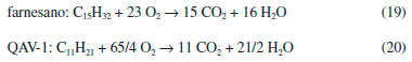 Poder calorífico de misturas farnesano com QAv-1 O poder calorífico representa a quantidade de calor liberada durante a combustao completa de um combustível e, consequentemente, adquire um valor que varia de acordo com a composiçao química do combustível. Há dois tipos de poder calorífico, classificados como superior (PCS) e inferior (PCI). O primeiro corresponde à quantidade de calor produzida por grama de combustível quando este sofre combustao completa, em excesso de ar, e os gases de descarga sao resfriados de modo que o vapor de água formado seja condensado (o calor contido no vapor de água é recuperado). O segundo equivale à quantidade de calor que um grama de combustível pode produzir quando sofre combustao completa, com excesso de ar, e a água é produzida e mantida no estado de vapor.22 As reaçoes de combustao completa do farnesano, Fns, e do querosene de aviaçao, QAv-1, sao representadas pelas seguintes equaçoes químicas: ![]() Variaçao do poder calorífico superior com a fraçao volumétrica de farnesano A Tabela 5 apresenta a média dos valores experimentais de poder calorífico superior (PCS) determinados em funçao da fraçao volumétrica porcentual de farnesano (Xv,Fns). Os valores das fraçoes em massa do farnesano na mistura sao também apresentados nesta tabela,
