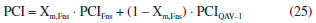 Os valores de PCI das misturas de farnesano com QAv-1 foram obtidos, também, a partir dos valores de PCI dos componentes puros utilizando-se a equaçao (25): ![]() em que PCIFns é 43883 J g-1 e PCIQAV-1, 43005 J g-1 (calculados através das mediçoes experimentais, Tabela 6). A Tabela 6 apresenta os valores de PCI calculados com as equaçoes (24) e (25) e os respectivos erros relativos percentuais. Observa-se uma concordância excelente entre os valores calculados com as duas equaçoes e os experimentais. O valor do desvio médio absoluto (dma) calculado para os conjuntos de dados obtidos com ambas as equaçoes resultou igual a 0,09%.