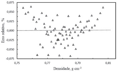![]() Figura 1. Erros relativos percentuais de densidade de misturas de farnesano/ QAv-1 calculada em funçao da densidade experimental
