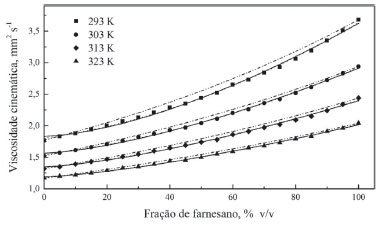 ![]() Figura 2. Valores experimentais (símbolos) e calculados (linhas) de viscosidade cinemática em funçao da fraçao volumétrica de farnesano - Eq. (5) ----- Eq. (6) -··- Eq. (7)