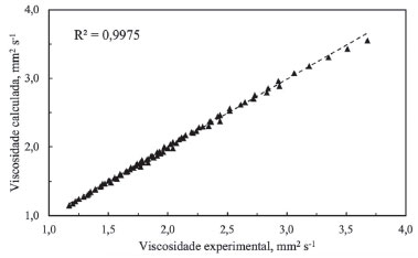 ![]() Figura 4. Correlaçao entre os valores de viscosidade cinemática calculados com a equaçao (14) e os valores experimentais