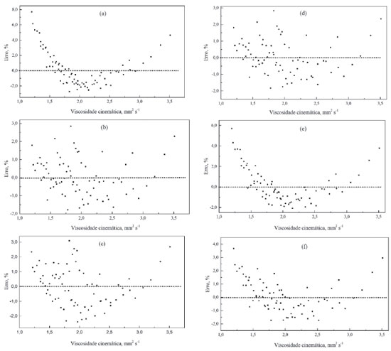 Considerando as equaçoes apresentadas, (13) a (18), os seis modelos foram aplicados para determinar os parâmetros que relacionam a viscosidade cinemática, das misturas de farnesano/querosene, com a fraçao e a temperatura. Os valores dos 76 dados experimentais de viscosidade cinemática, obtidos em funçao da fraçao volumétrica de farnesano (X) e da temperatura (T) para as misturas farnesano/QAv-1, foram utilizados. A Tabela 4 reúne os valores encontrados (a, b, c e d) para as equaçoes (13) a (18). Sao apresentados também os respectivos coeficientes de correlaçao (r2), os valores do desvio médio absoluto (dma) e a amplitude dos erros percentuais. Pode-se observar que os coeficientes de correlaçao sao muito bons para os seis modelos empregados, r2 ≥ 0,994. Utilizando os seis modelos de correlaçao apresentados na Tabela 4, os valores de viscosidade e os respectivos erros relativos foram calculados para as 76 misturas farnesano/QAv-1. Pode-se observar que os valores mais baixos de dma foram obtidos com as equaçoes (14) e (16). Por outro lado, os dados apresentados na mesma tabela permitem estabelecer que os modelos relativos às equaçoes (13) e (17) nao sao adequados. Apesar de os valores de dma serem perfeitamente aceitáveis, a faixa de valores de erro relativo é significativamente alta. Tem-se o intervalo de + 7,7% a - 2,3% para equaçao (13) e + 5,7% a - 2,1% para a equaçao (17). A Figura 3 apresenta a variaçao dos erros relativos em funçao da viscosidade cinemática experimental. Conforme se observa nas Figuras 3(a) e 3(e) relativas ao uso das equaçoes (13) e (17), sao evidentes os erros sistemáticos nos valores calculados da viscosidade cinemática. Considerando a faixa total de valores experimentais de viscosidade (ν = 1,17 mm2 s-1 a 3,68 mm2 s-1), tem-se que para valores mais baixos (ν ≤ 1,5 mm2 s-1) e mais altos (ν ≥ 2,9 mm2 s-1) de viscosidade, os erros sao sistematicamente positivos. Na faixa intermediária, a maioria dos erros é negativa.