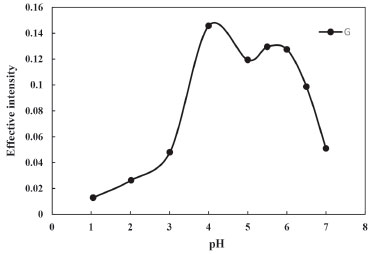 RESULTS AND DISCUSSION The solution of Phe in alkalic ethanol after CPE with Triton X-114, was scanned firstly, then the RGB parameters of the image of this solution were recorded. The G parameter was found to be the most sensitive signal without and with CPE (0.0199 and 0.2037 respectively for 3.0 mg L-1 of Phe). Also, by comparing the slope of the calibration curve before and after extraction, will be clarified, the effect of preconcentration and extraction on the improving of the sensitivity of the proposed method. Increasing the slope after extraction indicates that this procedure can be used as a sensitive method for the determination of Phe. In order to achieve a high extraction efficiency and enrichment factors, various factors which might have influenced the experiment were investigated. The optimization of parameters were carried out in an aqueous solution containing 3.0 mg L-1 of Phe respectively, by modifying one at a time method. Effect of pH The pH of the sample solution has a key role in the extraction of the target analytes because it affects the existing forms of analytes and their partitioning between the micellar phase and aqueous phase. Generally, the solution pH determines the charged form of analytes and thus affects the extraction efficacy of the target analytes. When ionizable species exist in solution for uncharged form, maximum extraction efficiency can be achieved.38 So, the influence of pH values on extraction efficiency and obtained signals was studied in the range of 2.0-7.0. Due to the acidity constants of Phe (pka1: 1.83 and pka2: 9.13),39 at low pH the neutral form of Phe transfers to the surfactant phase and the extraction efficiency increases. In extremely acidic pH, Phe becomes cationic, and therefore recovery is reduced. At higher pH, especially in alkaline solutions, the anionic form is mostly present and this causes a reduction in the extraction efficiency. As it is shown in Figure 1, the maximum effective intensity for Phe is achieved at pH 4.0. Therefore at this pH, Phe has the most affinity to surfactant phase and so the extraction efficiency is maximum. In the further experiments, pH 4.0 was selected as optimum.
