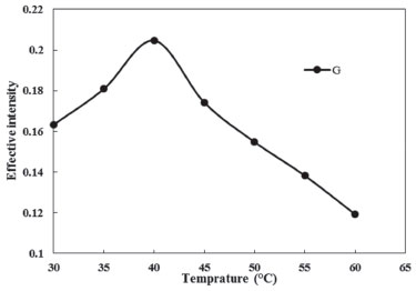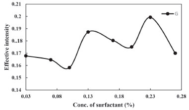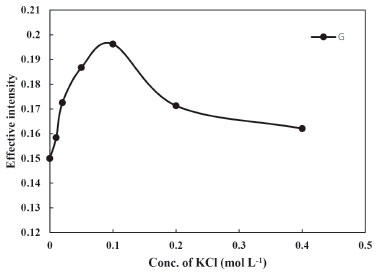 Effect of NaOH concentration (coloring agent) Consistent with this point that only colored analyte or solution can be studied by solution scanometric method, and Phe is colorless in acidic and neutral solution and it is pink in alkaline medium, thus after centrifugation and decanted bulk aqueous phase, the surfactant-rich phase must be dissolved in alkaline solution. So the surfactant-rich phase was diluted to 500 µL with NaOH solution in ethanol. The concentration of the NaOH solution was also investigated and optimized. As shown in Figure 7. the highest effective intensity for G parameter was obtained at 0.25 mol L-1 of NaOH.