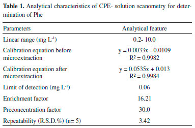 Analytical figures of merit Under the optimal conditions obtained above, the analytical performance of the proposed method was investigated. The results are listed in Table 1. A calibration curve was obtained (y = 0.0535x + 0.013) with a linear dynamic range of 0.2-10.0 mg L-1 and a correlation determination coefficient (r2) of 0.9984. The detection limit based on three times of the standard deviation of the blank (3Sb) for G factor was found to be 0.06 mg L-1 (n=5). The relative standard deviation (R.S.D.) for six replicate measurements of 3.0 mg L-1 of Phe was 3.42% for G parameter. As the R and B values does not change significantly by varying the concentration of Phe, the RSD and detection limit values were calculated only for G value. The preconcentration factor that define as ratio of the initial aqueous volume (15.0 mL) to the final volume (0.5 mL) was obtained 30.0. Finally, the calculated enhancement factor was up to 16.21 on the basis of division of sensitivity after and before extraction (calibration equations are shown in Table 1).