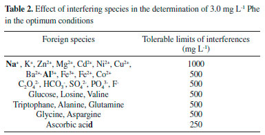 Interference study Due to the importance of the effects of matrix ions on the selectivity and utility of the method, the possibility of interferences of the various ions and organic compounds on the determination of 3.0 mg L-1 of Phe by the proposed method was studied. Variation over ±5% in the analytical signal that resulted from foreign species was taken as interference. The results are shown in Table 2. As it is observed most of the interferences that were tested do not have significant effect on the determination of Phe and many of them are tolerated at very high levels.